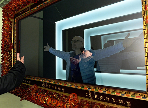 Пропуская вниманием входную инсталляцию из двух рам с зеркальным стеклом, в которое с одной стороны видишь себя, а с другой проходящих между рамами людей, в силу ее пресной банальности, не спасаемую уникальными тибетскими рамами, замечу, что замечательная работа на этой выставке все же есть.