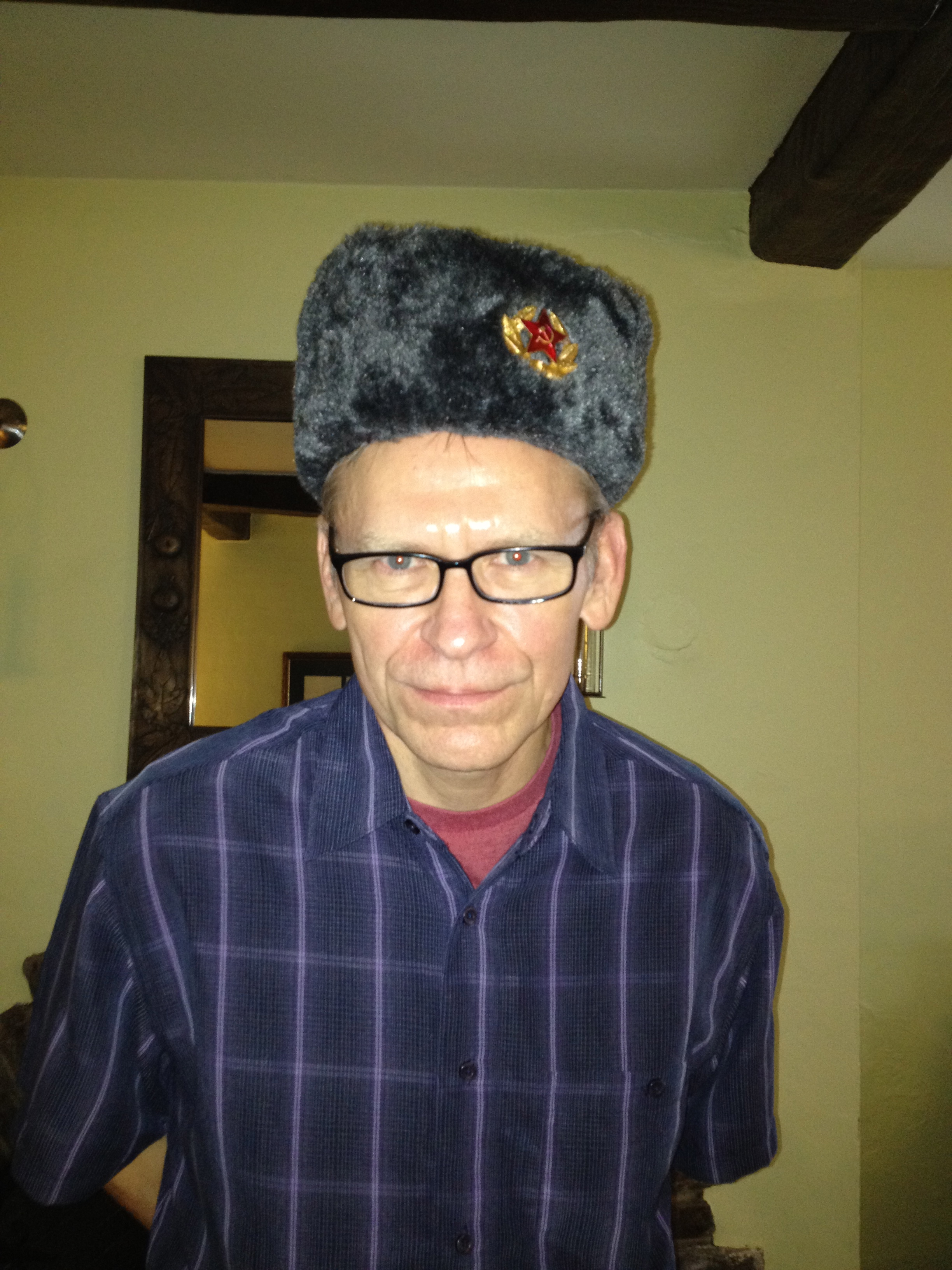 Я подарила Грегу... (не бросайте в меня камни))) ) - шапку-ушанку со звездой и русскую водку! И пусть банально, пусть даже пошло, но американцы таким подаркам не устают радоваться. Грег померил шапку несколько раз. Когда я его фотографировала, пошутил, мол, в такой шапке нельзя улыбаться, лицо должно быть очень серьезным.