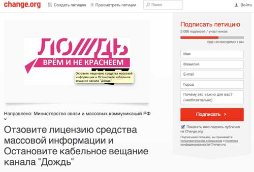 А вот две наиболее продвинувшиеся петиции противников «Дождя» (остальные набрали совсем мало голосов). 3 006 + 1 263 = 4 269 подписей, в 15 раз (!!!) меньше.