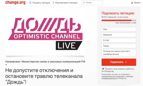 Вместо этого вы вполне в Оруэлловском духе (или в духе средневековой инквизиции, кому что больше нравится) требуете «запретить», «не пускать» и «отозвать лицензию» и даже пытаетесь собирать за это подписи. Впрочем, получается у вас плохо. Вот скриншоты голосования в защиту «Дождя» на 14 часов субботы, 8 февраля. Набрано 64 917 голосов.