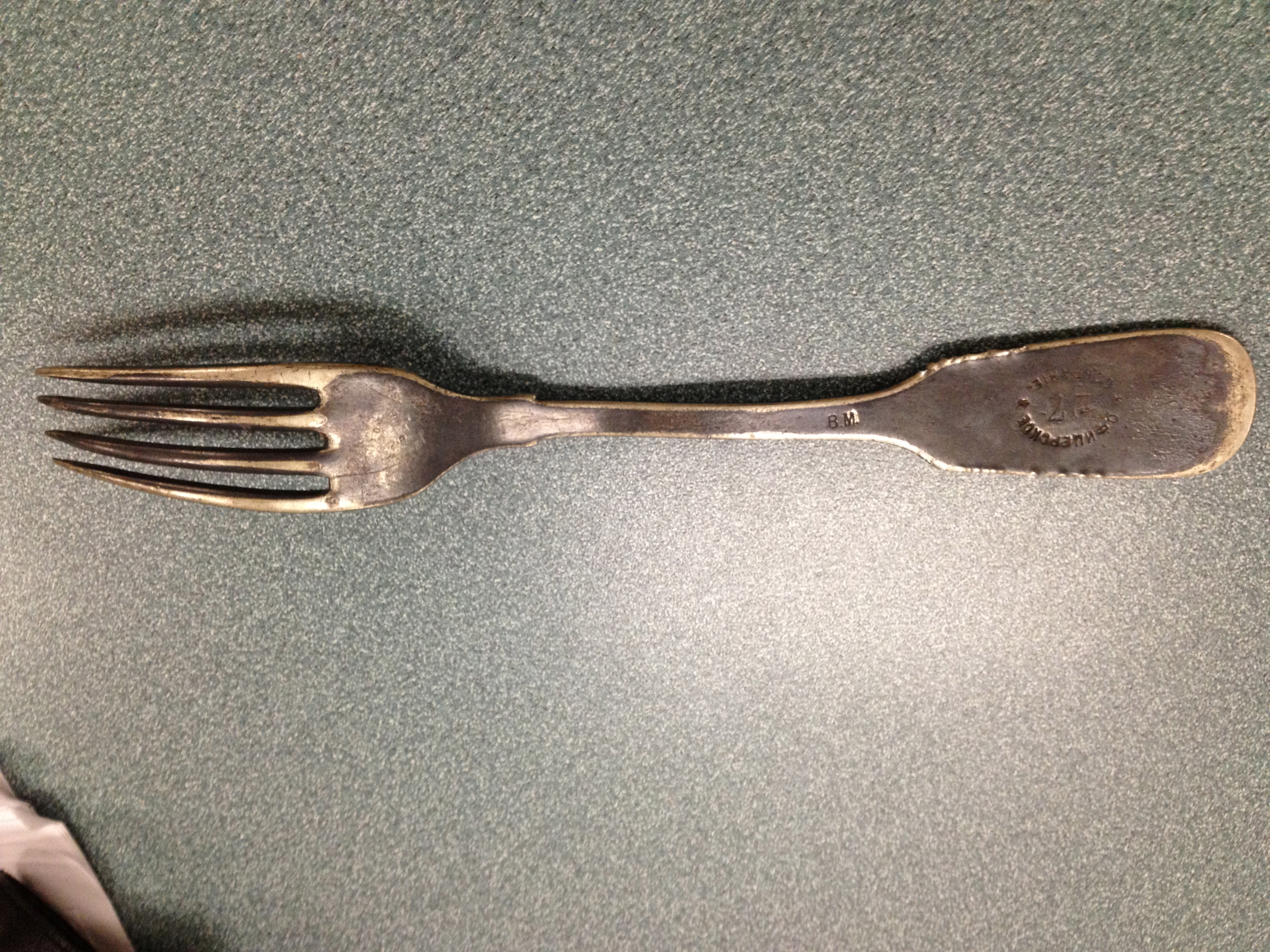 Итак, вилка. На ней надпись, и мой коллега полагал, что она на русском. Так и есть! На вилке написано «офицерское собрание» и есть еще штамп. Покопалась в интернете, но найти точную информацию о фабрике, которая изготовила вилку, не удалось. Мы предположили, что посуда предназначалась для зданий какого-то офицерского собрания. Я объяснила, что это вообще были за организации в царской России, почему офицеры собирались и какие вопросы на встречах обсуждали. Мой американский коллега сказал, что будет хранить эту вилку бережно и передаст потомкам.