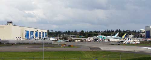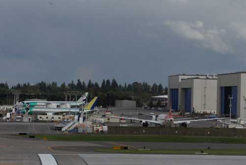 Это другой ангар, здесь происходит окраска. Перед ним можно увидеть еще не окрашенные самолеты – они имеют зеленоватый «алюминиевый» цвет (за исключением композитного 787-го, который изначально белый).