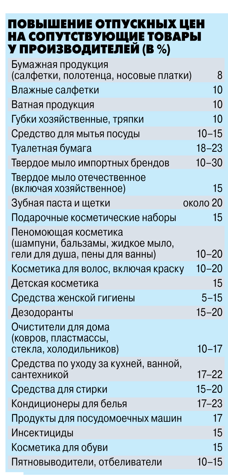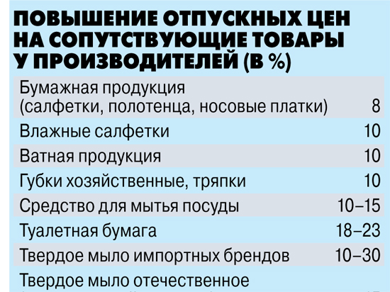 Из таблички видно, что у производителей в среднем товары подорожают на 10–20%. Приплюсуем столько же торговле. Получаем, что в магазинах цены возрастут как минимум на 20–40%.