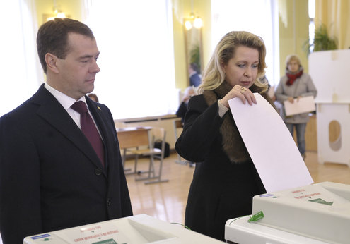 Президент России Дмитрий Медведев и его супруга Светлана проголосовали на выборах главы государства на избирательном участке №2634 в здании московской школы №1118.