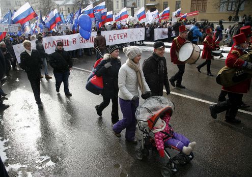В центре стлицы прошел марш в зашиту детей против усыновления российских детей иностранцами. По данным полиции, в нем приняли участие около 20 тысяч человек. Во главе колонны шел духовой оркестр. В небе барражировал вертолет. Опрошенные «МК» участники рассказали, что возмущены гибелью в Техасе Максима Кузьмина. Мальчик погиб несколько дней назад при невыясненных до конца обстоятельствах. Участники держали в руках плакаты: «Я - сирота», «Я – будущая мать», «Не отдадим наших детей».