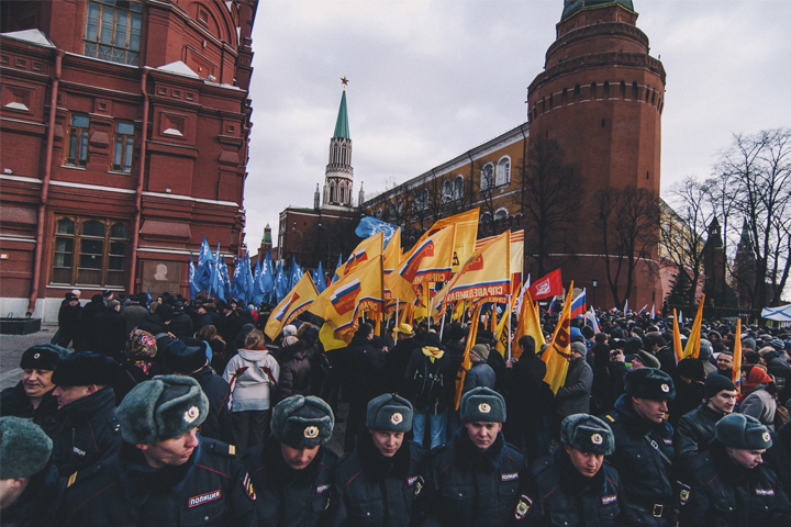 Вечером 18 марта на Красной и Манежной площадях прошел митинг-концерт «Мы вместе». Провластная акция, посвященная официальному присоединении Республики Крым к России, собрала, по данным полиции, свыше 100 тысяч человек. Со сцены выступили премьер-министр республики Сергей Аксенов, председатель горсовета Севастополя Алексей Чалый и, собственно, Владимир Путин. «Уважаемые граждане России, крымчане, севастопольцы. После долгого, изнурительного плавания Крым возвращается в родную гавань. В Россию», — говорил президент. Толпа радостно его поддерживала, скандируя «Ура» и «Россия» и к восьми вечера разошлась. Среди прочего, на митинге-концерте выступала группа «Любэ», запомнившаяся корреспонденту рифмой «Рассея-Енисея».