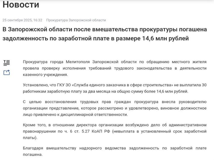 26.09.2025, 10:45 227 В Запорожской области 30 работникам выплачен долг по зарплате более 14,6 млн рублей