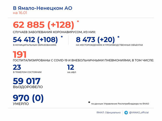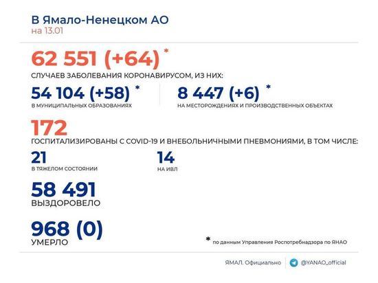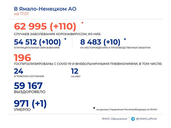17.01.2022, 11:46 589 На Ямале за сутки зарегистрировали 110 заболевших коронавирусом и 1 смерть среди ковид-пациентов