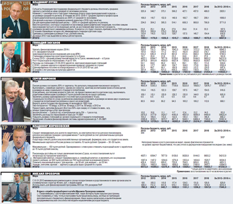 У Геннадия Зюганова заявленный объем социальных обязательств таков, что уже к концу срока президентства они будут почти равняться всем государственным расходам. А как же тогда быть с выполнением других обещаний? К примеру, Геннадий Зюганов обещает, что в период 2013–2016 гг. госинвестиции в развитие промышленности увеличатся не менее чем на 20 трлн. рублей.