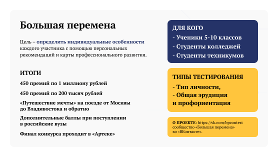 В «Большой перемене» могут участвовать ребята 5–10-х классов, а также студенты колледжей и техникумов. Конкурсанты проходят тесты на интеллект, тип личности, общую эрудицию и профориентацию, благодаря чему подбираются испытания, которые максимально раскрывают потенциал подростка. Есть также мотивационные задания, которые помогут определить приоритеты и ориентиры участника, а работа с кейсами научит трудиться в команде и решать поставленные задачи.
