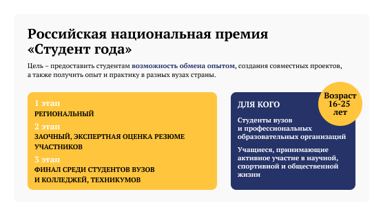 Уникальный конкурсный и образовательный проект для студентов вузов и профессиональных образовательных организаций, которые принимают активное участие в учебной, научной, спортивной и общественной жизни. За звание «Студент года» могут побороться молодые люди в возрасте от 16 до 25 лет.