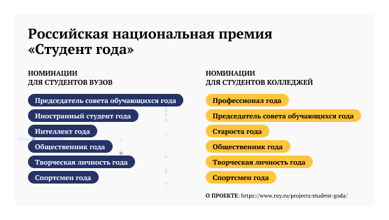 Например, студенты вузов могут участвовать в таких номинациях: «Председатель совета обучающихся года», «Общественник года», «Интеллект года», «Иностранный студент года», «Творческая личность года», «Спортсмен года».