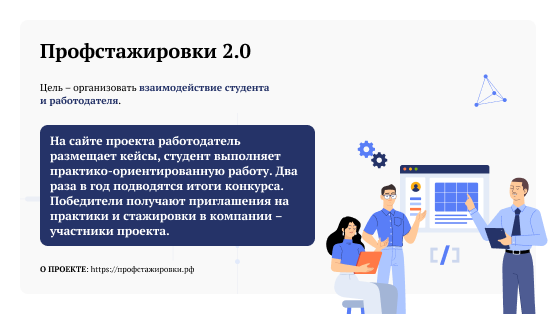 «Профстажировки 2.0» – это механизм, с помощью которого происходит взаимодействие студента и работодателя. На сайте проекта работодатель размещает кейсы, студент выполняет практико-ориентированную работу. Часто этот кейс становится основой курсовой или дипломной работы. Два раза в год подводятся итоги конкурса. Победители получают приглашения на практики и стажировки. Среди партнеров-работодателей такие компании, как Россети, Аэрофлот, Роскосмос, Росатом, КамАЗ, Северсталь и многие другие.