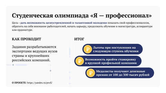 Это возможность для целеустремленных и талантливых молодых людей не только показать свой профессионализм, но и обратить на себя внимание работодателей, начать карьеру в профильной компании или продолжить обучение в магистратуре, аспирантуре или ординатуре.