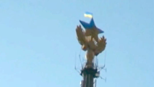 В Москве на вершине сталинской высотки неизвестные водрузили флаг Украины. Их попытку покрасить звезду пресекла полиция. Видео опубликовано на портале youtube.com пользователем Yuriy Fedorosh