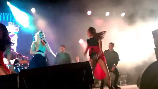В Сети набирает просмотры ролик, на котором экс-солистка "ВИА Гры" Вера Брежнева дважды чуть не лишилась юбки во время своего выступления в Красноярске. Певица, сдерживая истерический смех, продолжала петь. Видео: youtube.com/dastan beysebaev