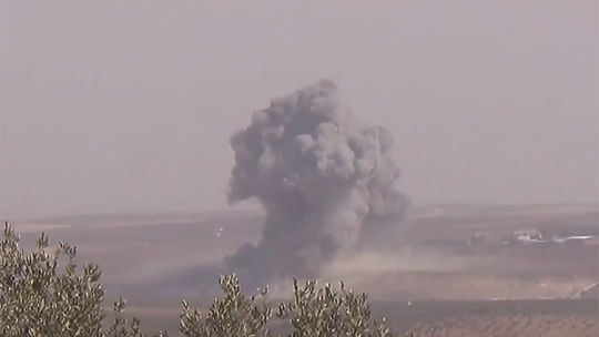 На видеозаписи - кадры авиаудара, предположительно нанесенного российскими ВКС по позициям ИГИЛ (запрещенов в РФ) в Сирии. Видео опубликовано на сайте youtube.com пользователем Vox Populi Evo.
