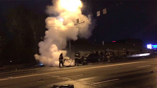 В Москве на Крымском мосту произошло ДТП с участием суперкара. Ferrari несся с огромной скоростью по встречке, затем влетел в рекламный щит, протаранил ещё два автомобиля и сгорел дотла. Видео опубликовано на сайте youtube.com пользователем Александр Гоголев.