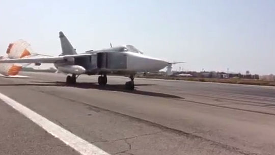 На видео запечатлено приземление штурмового бомбардировщика Су-24 на авиабазу в Хмейми. После посадки самолет отбрасывает тормозной парашют на взлетную полосу, затем парашют подбирают техники, его укладывают и увозят.