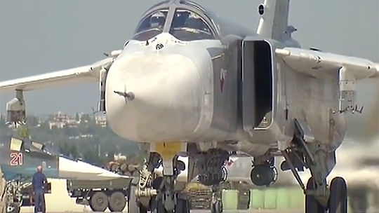 Авиагруппа ВКС РФ совершает боевые вылеты против ИГИЛ (запрещено в РФ) с аэродрома Хмеймим. Видео опубликовано на сайте youtube.com пользователем Минобороны России.
