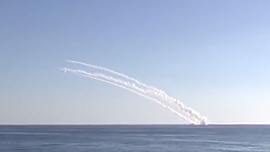 Минобороны РФ опубликовало кадры нанесения ракетного удара подводной лодкой "Ростов-на-Дону" по позициям террористов в Сирии. Атака была произведена крылатыми ракетами "Калибр".
