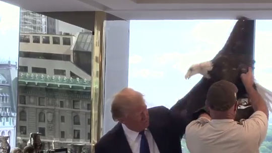 Кандидат в президенты США Дональд Трамп подвергся атаке со стороны ручного орла по прозвищу Дядя Сэм во время фотосессии. Птица неспокойно вела себя на руке политика и несколько раз пыталась клюнуть американского миллиардера.