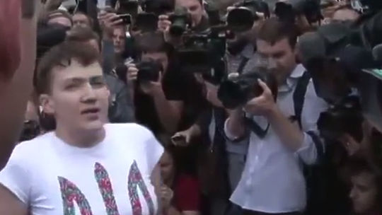 Надежда Савченко прибыла в киевский международный аэропорт Борисполь. Сразу после выхода из здания аэропорта украинская летчица произнесла крайне эмоциональную речь. Затем она и её сопровождающие отправились в администрацию Порошенко.