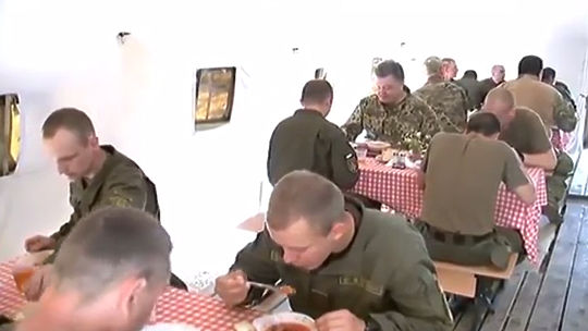 Украинский президент навестил бойцов нацгвардии и отобедал с ними борщом. Соответствующий видеоотчет Петр Порошенко разместил на своей странице в соцсети. При этом ряд российских СМИ, в частности "Вести", утверждают, что видео было опубликовано с купюрами. Якобы в оригинальном ролике видно, что в какой-то момент один из солдат похвалил "отличный русский борщ", из-за чего Порошенко невольно поперхнулся.