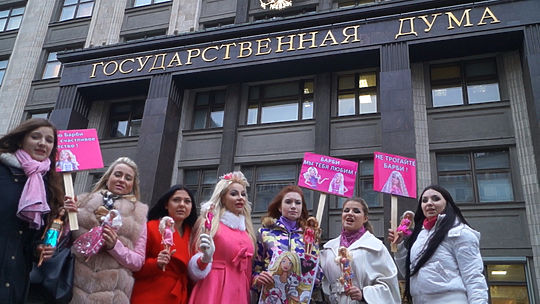 Девушки-фанатки знаменитой куклы собрались сегодня у ГД РФ, чтобы защитить любимую многими детьми барби. Активистки выкрикивали лозунги: "Не трогайте барби!", "Мир, труд, барби!", "Барби, мы тебя любим" и другие. Цель митинга - привлечь внимание общественности к законопроекту, согласно которому многие зарубежные игрушки, в том числе знаменитые куклы, будут сняты с продажи на территории РФ.