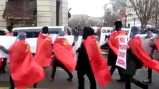 Спецкорр "МК" сняла на видео странных демонстрантов. Небрежно накинув на плечи флаги СССР, они шествуют с плакатами "работники Кремля", "вернем России былое величие", "КГБ за Трампа". Кто это, пока остается загадкой.
