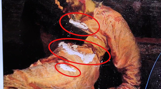 Спустя три дня музейные работники Третьяковской галереи отошли от шока после атаки вандала на картину Репина "Иван Грозный и сын его Иван" и показали, какие увечья получило полотно.