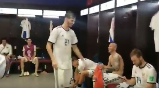 Российские футболисты начали отмечать свой триумф прямо в раздевалке, многократно прокричав «Молодцы!». В честь долгожданной победы над испанцами игрок ФК "Краснодар" Федор Смолов даже станцевал на столе.
