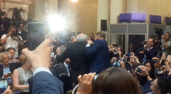 Совместная пресс-конференция Владимира Путина и Дональда Трампа в Хельсинки ознаменовалась скандалом: охрана скрутила в зале журналиста американского издания Nation. Мужчина держал в руках табличку с надписью, касающейся Договора о запрещении ядерного оружия. На кадрах видно, как секьюрити жестко винтят репортера - он сопротивляется, журналиста выводят.