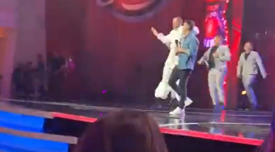 Президент Украины Владимир Зеленский во время съемок очередного юмористического шоу станцевал на сцене вместе с его участниками. Он поприветствовал зрителей, поцеловал в голову ведущего шоу и спустился в зрительный зал к своей супруге. Ранее, Зеленский некоторое время сам был ведущим этого юмористического телешоу. Видео опубликовано в Instagram пользователем verniaiev13