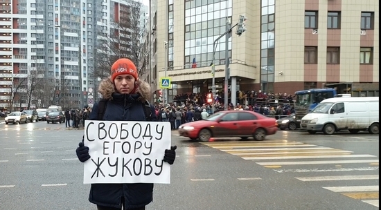 В пятницу, 6 декабря, в Кунцевском районном суде Москвы решается судьба 21-летнего студента Егора Жукова. Власти признали его видео экстремистским, прокуратура требует для него 4 года тюрьмы. С раннего утра к зданию суда подтянулись сотни людей, которые хотят поддержать парня, которого считают невиновным. На другой стороне дороги проходят одиночные пикеты.