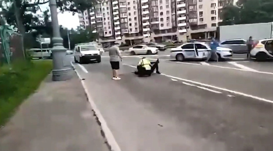Очевидец снял момент, когда раненый сотрудник ГИБДД скручивает водителя такси, устроившего стрельбу на Ленинском проспекте в Москве. Двое гаишников остановили такси для проверки, водитель внезапно открыл стрельбу и ранил полицейских. Несмотря на ранения, они задержали преступника. На кадрах запечатлен момент борьбы.