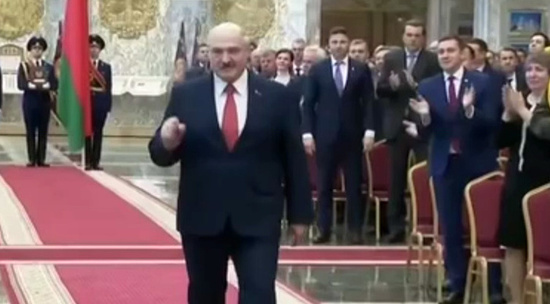 Белорусское ТВ показало первые кадры с церемонии инаугурации белорусского президента Александра Лукашенко. Дата и время мероприятия до последнего хранили в тайне, опасаясь оппозиционных акций. Во Дворце Независимости в Минске Лукашенко собрал около 100 самых "проверенных" чиновников и политиков. Зал стоит навытяжку, пока Батька произносит присягу. Затем он с улыбкой принимает от главы ЦИК Ермошиной президентское удостоверение, а от девушки в национальном костюме - букет.