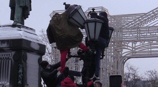 На несанкционированной акции сторонников Алексея Навального в Москве на Пушкинской площади человека сбросили с фонаря. Его лозунги не понравились протестующим. Мы сняли этот эпизод на видео.