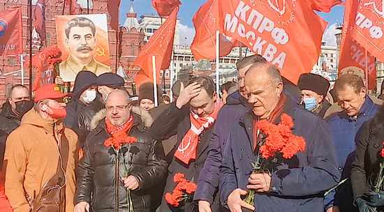 5 марта коммунисты России отметили очередную годовщину смерти Сталина. Партийные лидеры и сочувствующие возложили цветы к могиле "вождя народов" у кремлевской стены. После церемонии Геннадий Зюганов выступил с торжественной речью, в которой призвал всех пойти и поклониться "гению Сталину за его "достижения" и призвал Путина "быть русским человеком по духу". Мы сняли на видео фрагмент мрачной церемонии.