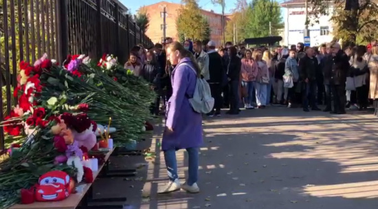 У входа университет Перми, где накануне Тимур Бекмансуров убил шестерых и ранил более 20 человек, устроен импровизированный мемориал с цветами, свечами и мягкими игрушками. Студенты университета собрались возле него, чтобы почтить память погибших. Весь город в трауре, соученики убитых тревожно обсуждают случившееся. Мы публикуем видео из пермского университета.