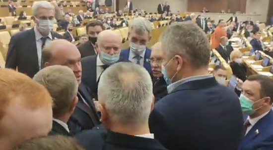 Сегодня Госдума приняла так называемый законопроект о QR-кодах, причем его нынешняя версия после публичных обсуждений выглядит гораздо мягче изначальной. Например, QR-коды смогут получить переболевшие коронавирусом граждане, у которых есть антитела. Однако членам фракции КПРФ в Госдуме законопроект не нравится. Они пришли на сегодняшнее заседание с плакатом, который подобал бы антиваксерам. В результате завязалась потасовка, а спикер Вячеслав Володин был вынужден призывать к порядку. Видео опубликовано в Twitter Михаилом Матвеевым.