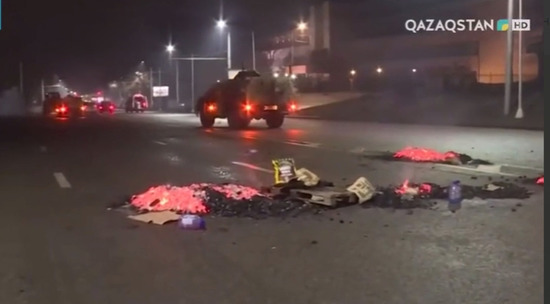 Телевидение Казахстана показало видео зачисток в центре Алма-Аты. Ряды силовиков в полной защитной экипировке наступают на протестующих, стуча дубинками в щиты для устрашения и бросая светошумовые гранаты. По городу ездит бронетехника, работают пожарные машины (накануне протестующие жгли подобные автомобили, которые пытались потушить здание алма-атинской мэрии - акимата, которое в итоге сгорело дотла). На обочинах видны раскуроченные гражданские автомобили.