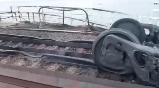 В соцсетях появилось видео, снятое на поврежденной железнодорожной части Крымского моста. После взрыва грузовика в товарном поезде, ехавшем по мосту, загорелись несколько цистерн с топливом. На кадрах ролика видно, что от жара рельсы под колесами горящих цистерн деформировались и расплавились.