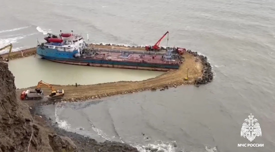 На черноморском побережье продолжается ликвидация последствий разлива мазута из разбитых штормом танкеров. Сотрудники МЧС обследуют зону экологической ЧС с вертолетов. Морспасслужба сообщила, что началась откачка топлива из застрявшего на мели у мыса Панагия судна "Волгонефть-239" (всего в его емкостях находится около 1,5 тысяч тонн мазута). Вокруг корпуса танкера построили искусственную насыпь длиной 400 метров.