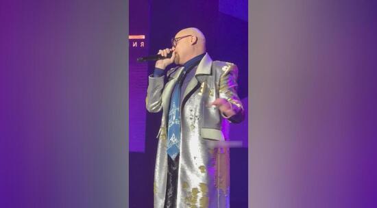На сцену он вышел в дизайнерском плаще, который сразу привлек внимание зрителей.